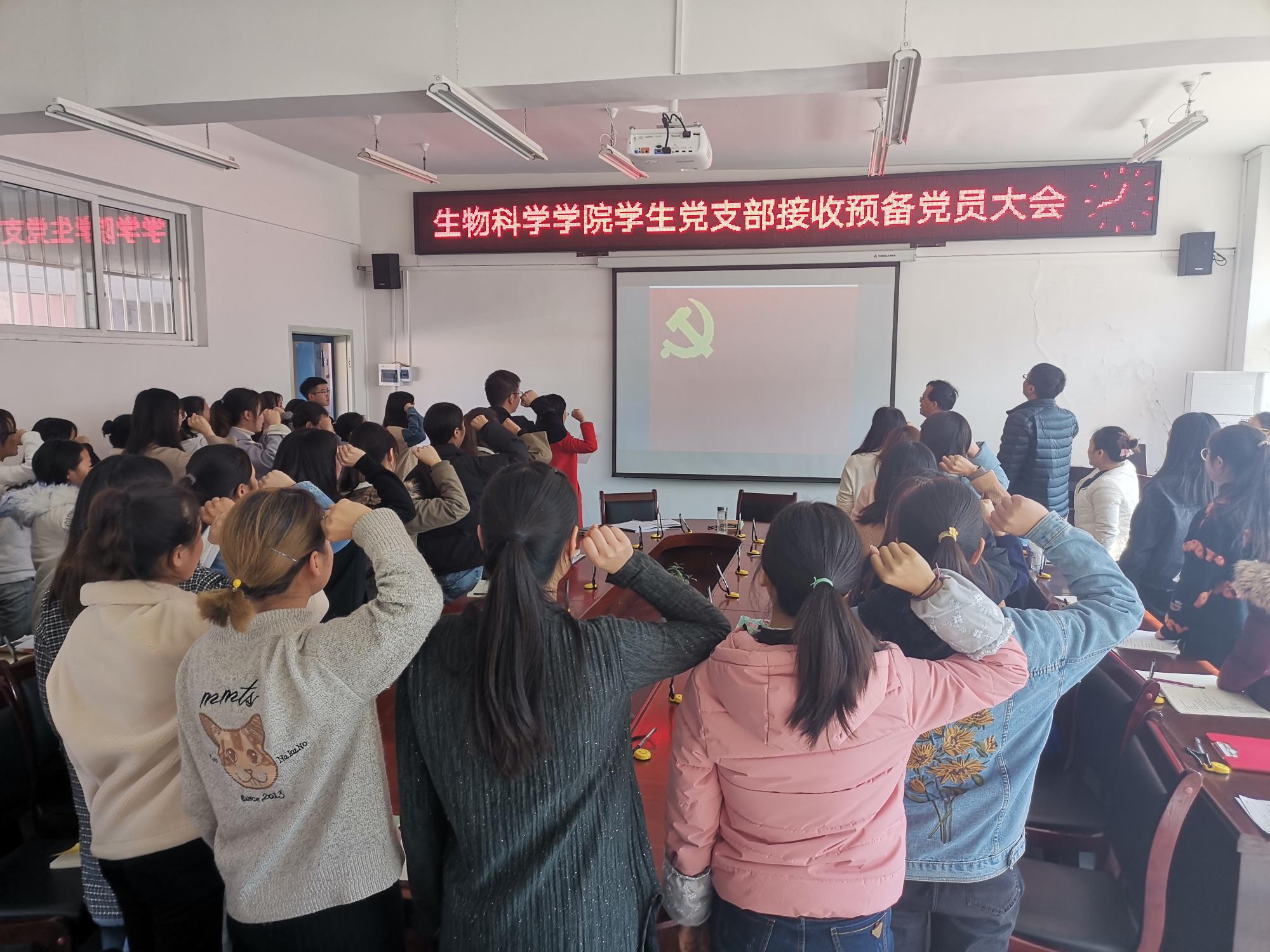 李育芳带领新接收的15名预备党员宣读入党誓词,全体党员同志重温了入党誓词。孙秀华、梁涛为新接收的15名预备党员佩戴了党徽。