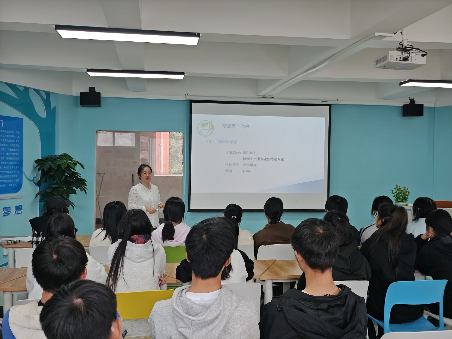 罗倩就公司办学特色、团队力量、教学科研成果以及育人成效几个方面为员工仔细集团专业的发展前景;接着,她以应用生物科学专业为例,通过影片导入、优秀学子成长案例分享等丰富形式,详细介绍该专业的人才培养方案,强调了该专业育人目标旨在培养员工德智体美劳全面发展,具有三农情怀、爱岗敬业精神、较好的植物生产基础理论知识和技能,富有创新意识,能从事贵州特色生物资源开发、满足农业、生物产业生产加工的应用型人才;所以该专业既注重基础理论的打牢,又强调实践能力的培养,注重“一践行、两学会”,不仅需要学习生物学相关专业核心课程,还需学习统计学、实验设计与分析、计算机编程等辅助课程,全面提升员工的科研素养和实验技能,希望同学们在5年后成为所在单位有发展潜力的业务能手。