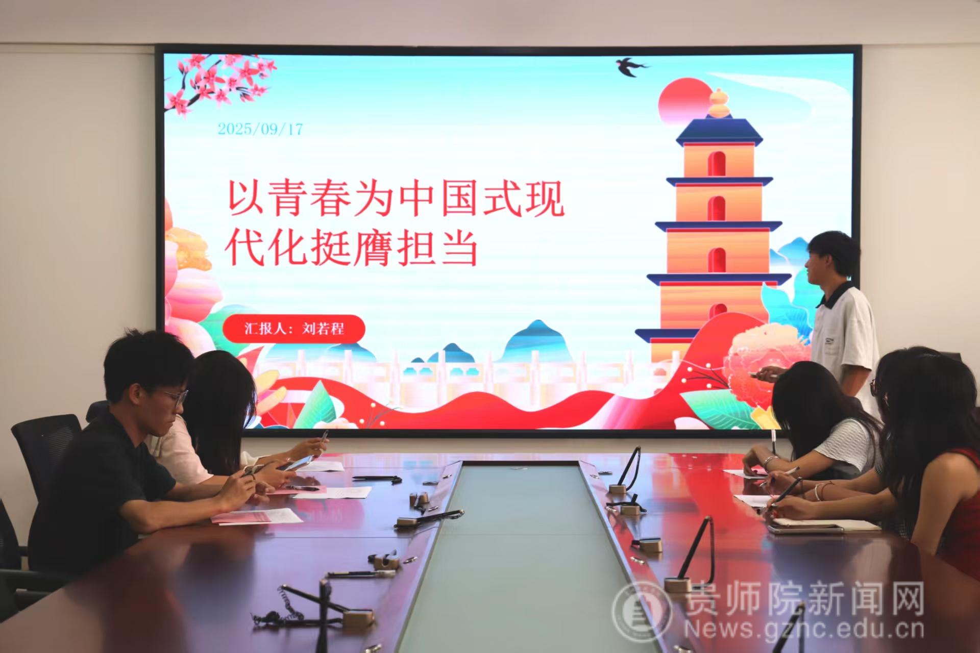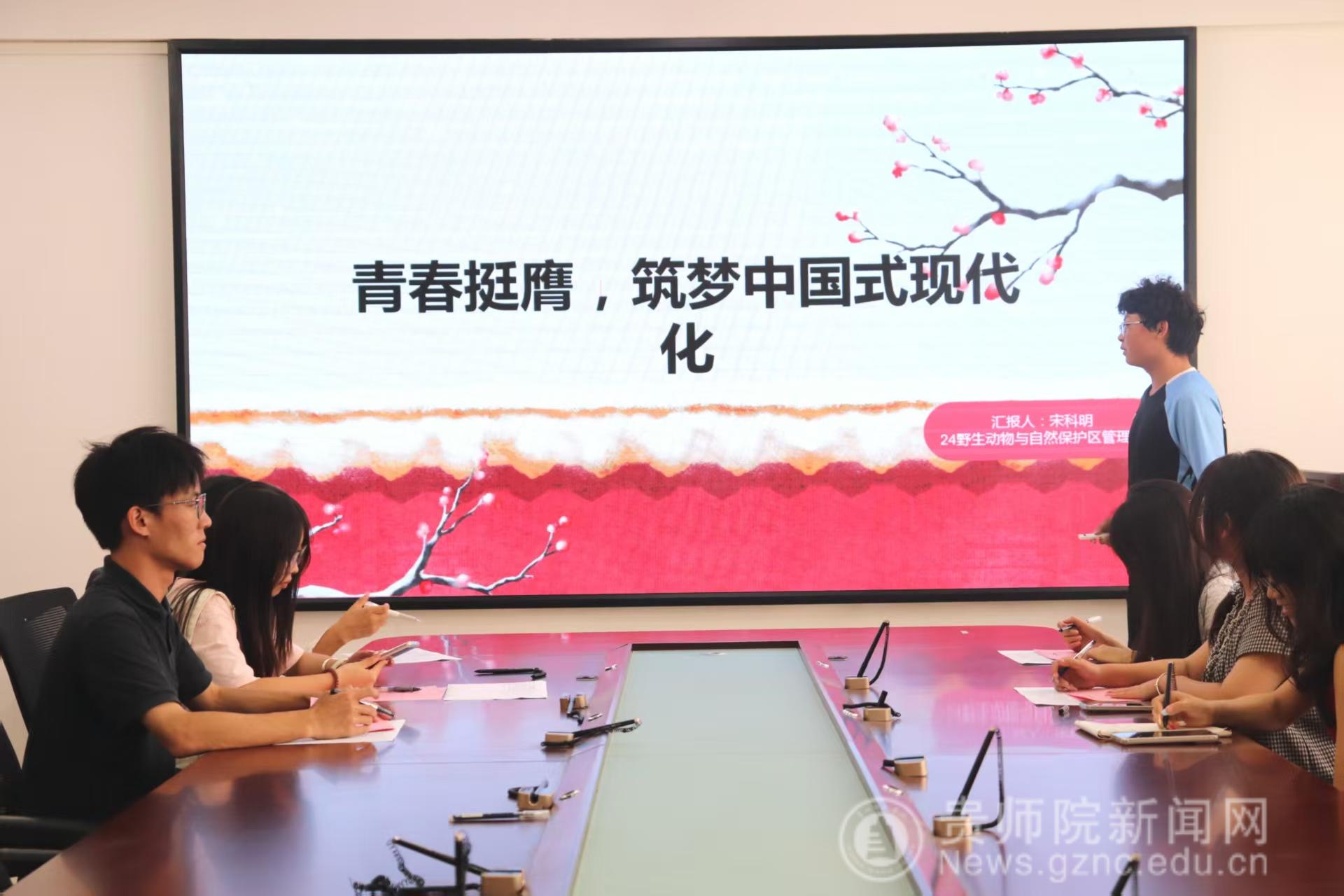 团课中,各团支部分工协作、亮点纷呈。24级应生一班团支部聚焦西江千户苗寨,讲述当地青年推动苗绣、银饰锻造等非遗从“小作坊零散干”到“产业链抱团闯”的转型,通过非遗主题民宿等创新实践,为乡村振兴注入青春动能;24生物科学班团支部以遵义会议和长征精神为核心,介绍有志青年用红色主题直播、沉浸式研学活化红色文化的做法,阐释长征精神对青年学业科研的激励作用;24野保班团支部和24应生二班团支部则围绕“中国式现代化的内涵与时代意义”等三大板块,从理论层面剖析核心要义,结合实践案例展现青春与时代的同频共振。