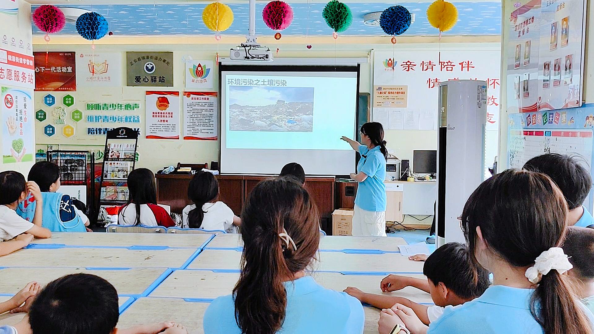 在益童乐园里,青年女老员工李小吕站在讲台前,身后的投影仪播放着PPT,展示着垃圾污染的图片。她说道:“小朋友们,垃圾随意丢弃会伤害地球,塑料垃圾难分解,会污染土壤和水源,还会伤害我们的身体。”小朋友们听得认真,其中罗梦涵小朋友举手问道:“姐姐,我们能做些什么?”李小吕切换PPT,展示垃圾治理示意图,耐心解释:“我们可以从垃圾分类做起,让可回收垃圾重新利用,有害垃圾安全处理,厨余垃圾变肥料。”另一个小女孩周嘉怡说:“垃圾分类好难,我怕做不好。”李小吕安慰她:“没关系,记住小窍门就会很容易,我们一起学习垃圾分类歌,塑料瓶、纸张是可回收垃圾,电池是有害垃圾,剩饭剩菜是厨余垃圾,多观察、多学习,和爸爸妈妈一起做,就能做更好。”宣讲结束后,小朋友们纷纷表示要从自己做起从身边的小事做起,做洁净环境的保护者。