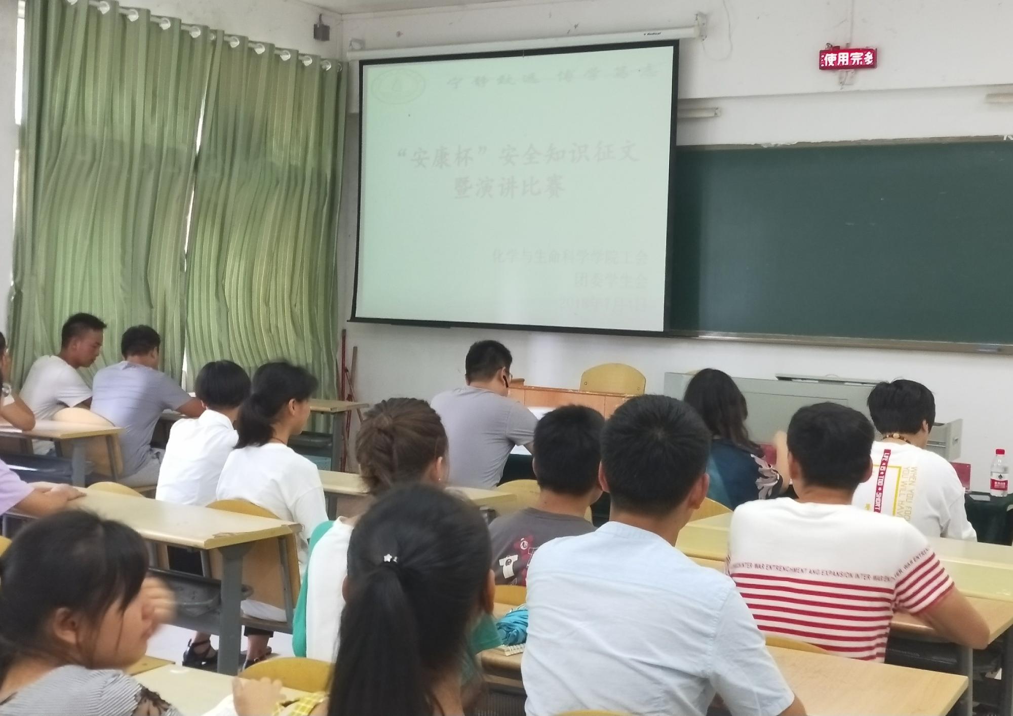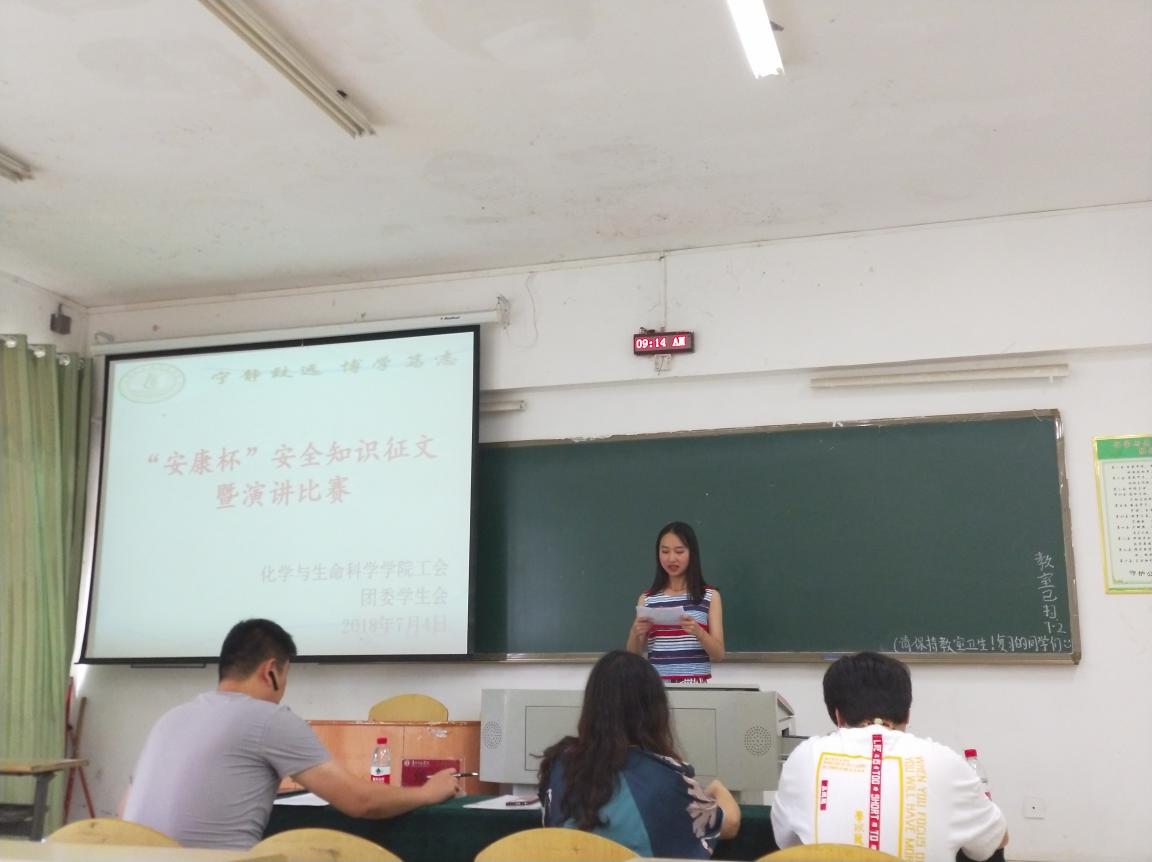 为深入宣传和贯彻落实《劳动法》、《工会法》、《安全生产法》和《职业病防治法》等相关法律法规,增强教职工生的安全卫生法治意识,由校工会主办,化生公司基层工会承办,化生公司基层团委协办的“安康杯”系列活动之“安全靠大家,幸福你我他”主题征文及演讲活动,于7月4日在致远楼513教室举行,公司工会主席冉晓燕及赵雪宇、甄承老师担任本次演讲比赛决赛的评委,2017级化学及生物科学专业员工参加了此次活动。征文内容丰富,形式多样。有题为“居安思危,莫忘校规”,“寝室卫生与安全”,“食品安全是生命的门户”,“浅谈网络安全”等的文章,也有以“瞬间”,“生命如此美丽”为题的诗歌等。从中推选出优秀作品进行演讲比赛。
