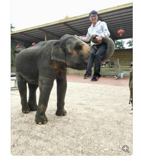 员工施辉情与饲养的非洲大象同欢乐