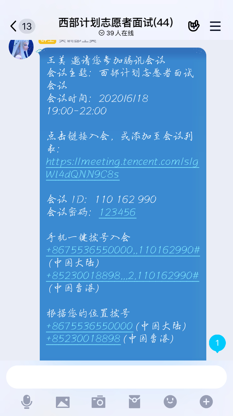 经过前期笔试和心理测试考核,在充分筹备的基础上,mjm世界杯官网基层团委2020年6月18日在腾讯会议举行了2020届毕业生西部志愿者计划岗位面试会议。公司党总支孙秀华书记,院团委负责人梁涛老师,毕业班辅导员李育芳老师,专职辅导员王溯老师,校团委副书记甘圣义,mjm世界杯官网基层团委主要成员等担任面试官和协调员,2020届毕业班符合面试资格的同学参加面试。面试采取多对一的方式进行面试考察,主要考察面试者西部志愿岗位相关知识和个人政治素质。3个小时面试会议中,对每一位面试者进行了逐一考察和打分。