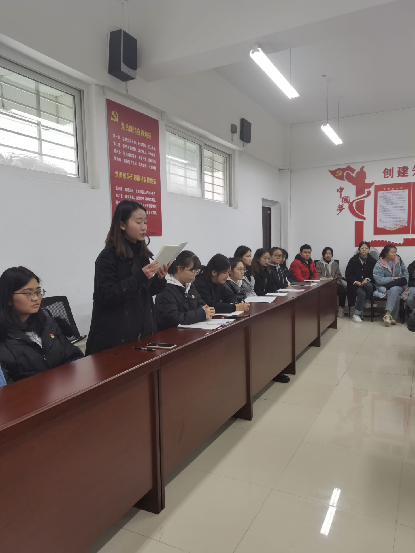 大会围绕接收邱依婷、张雨、李安珍、杨雨荣、周美等17名预备党员转正。讨论邱依婷、张雨、李安珍、杨雨荣、周美、姜丹丹、李旭、吴桂英、谢转艳、杨琴、张彩虹、张震欢、冯梅、黄青、姜桂琴、彭丽、谢华艳等17名同志是否转正。由预备党员邱依婷作为代表宣读《入党志愿书》,并进行批评和自我批评(即向支部党员大会汇报自己在预备期间的表现,肯定成绩和进步,找出缺点和不足,表明自己的态度和决心)。大会认为,邱依婷、张雨、李安珍、杨雨荣、周美等17名同志基本符合党员条件,经与会正式党员投票表决,大会一致同意接收邱依婷、张雨、李安珍、杨雨荣、周美等17名同志成为中共党员。本支部党员共34人,其中正式党员5人,预备党员29人,正式党员实到5人,符合开会条件,计票人为罗爱霞、刘家宏,监票人为宋玫,本次会议采用无记名投票。
