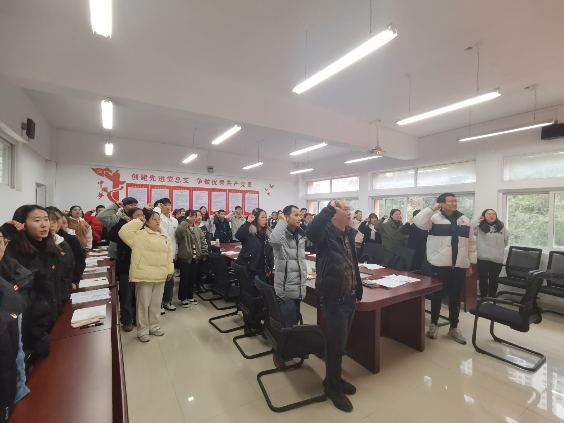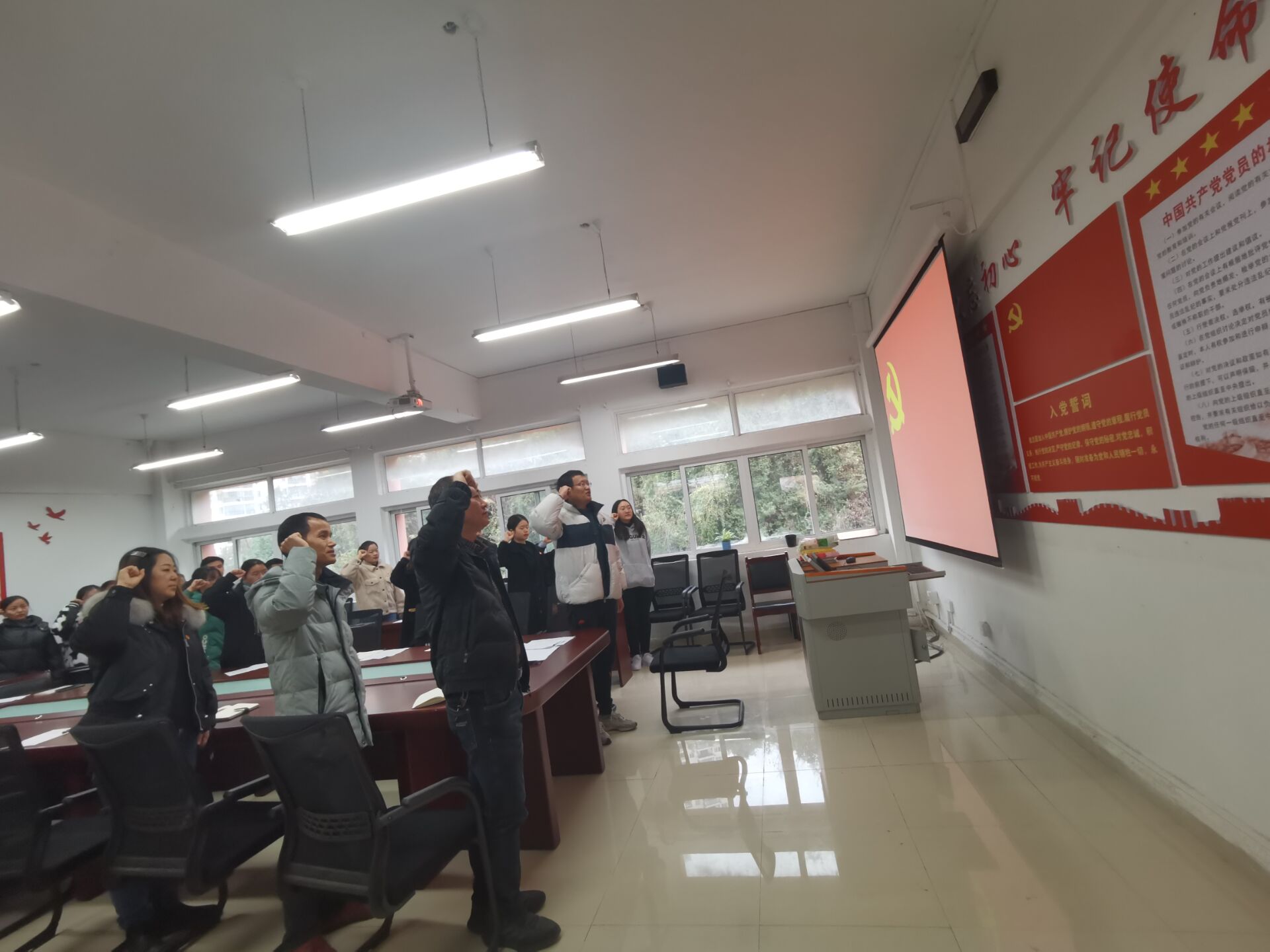 会议宣布后,党员同志们,面对党旗进行庄严宣誓,也向大会表达了自身的想法与决心,不忘初心跟党走,在今后的学习工作中,坚定目标、严格要求自身,努力改正现有不足,积极向优秀共产党员学习树立先锋模范作用,争取成为共产党的先锋人。