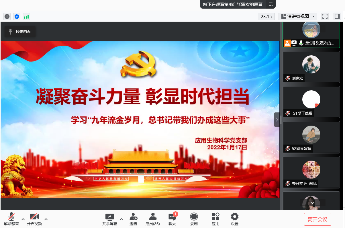 时光荏苒,岁月流金。2022,已然来临,1月17日晚,由第九期党员张震欢主持开展凝聚奋斗力量,彰显时代担当—学习“九年流金岁月,总书记带我们办成这些大事”主题党日活动。参与本次活动的有应用生物科学专业员工党支部书记程搏幸、全体正式党员、入党积极分子。