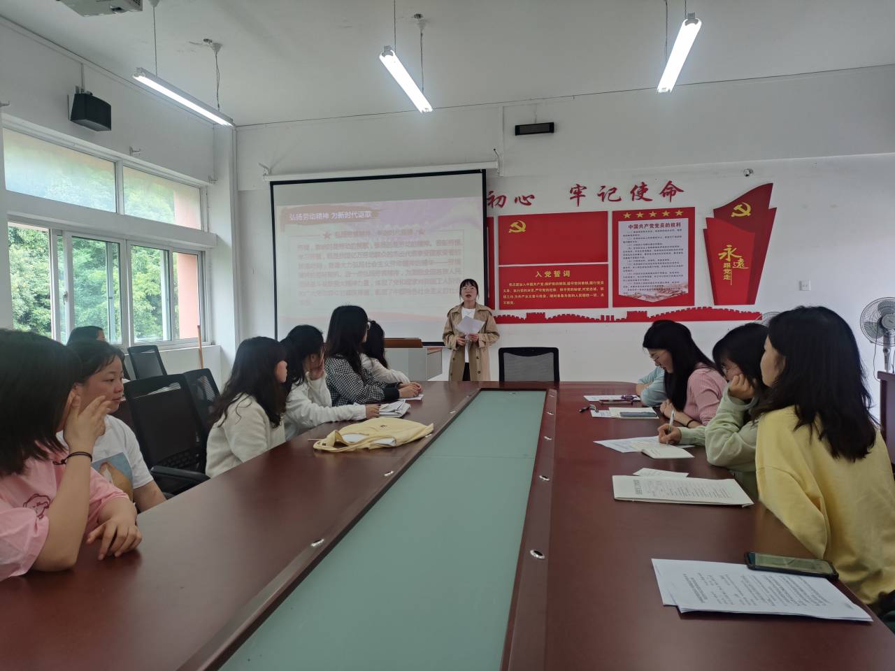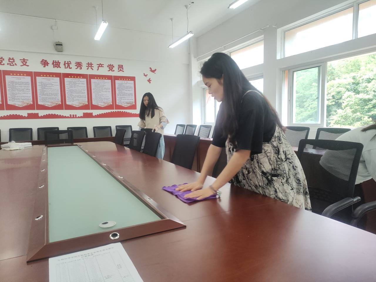 活动伊始,毕业生党员万嘉欣向大家讲述了劳动节的由来以及劳动楷模袁兴建、邓稼先的光辉事迹等,旨在激励同学们热爱劳动,珍惜劳动成果,学习劳模精神,不断增强青年党员的责任感和奉献意识。接着,员工党员集体开展劳动实验环节,毕业生党员自告奋勇,积极主动帮助老师打扫办公室、会议室、走廊等。全体党员分工明确,有的负责打扫,有的负责倒垃圾,有的打水,有的擦桌,大家不放过任何一个卫生死角,忙得不亦乐乎。
