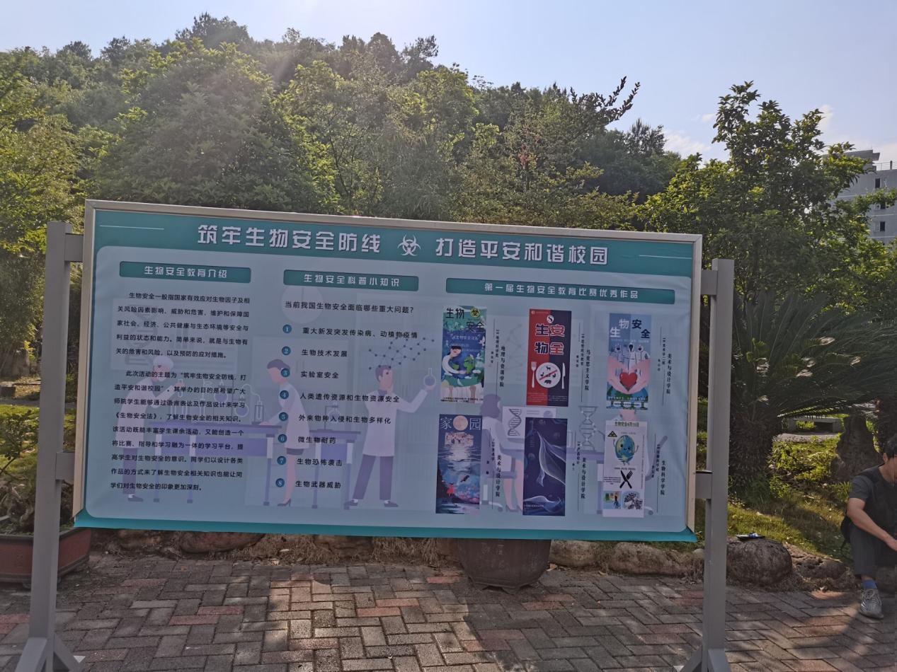 在鉴湖员工流动较大的地方放置了“筑牢生物安全防线、打造平安和谐校园”的展板方便过往的员工了解生物安全,并且在展板中还展示了生物安全赛事的具体内容、活动时间、赛事渠道等,让过往的员工了解生物安全赛事活动,展板的图画激发起员工的阅读兴趣,还让员工了解到生物安全。