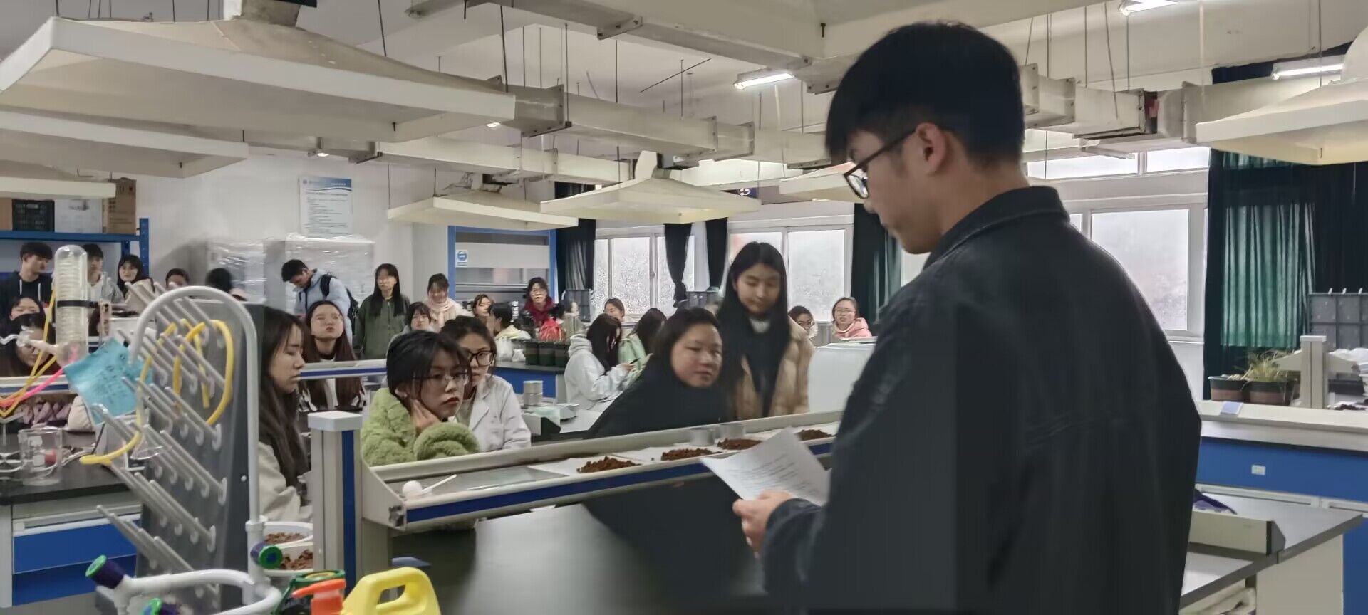 依次从着装、进出实验室要求、实验室卫生、实验仪器安全及管理、实验药品、易耗品管理、防护用品的使用方法等各方面对参训员工进行培训。并且讲解了关于本学期实验课程结束后实验室卫生的相关注意事项,并要求参训班干将培训的内容转告到班级的每一位同学,培训后对各班同学进行实验室安全准则考试。