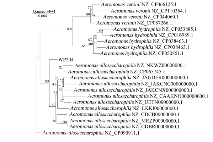为厘清蚂蟥“红肿病”病因,课题组从患“红肿病”蚂蟥病灶处分离到8株细菌,经科赫氏法则验证了4株细菌是蚂蟥患“红肿病”的细菌性病原菌,其中WP204细菌致病性最强,导致蚂蟥腹部出血发红,躯干水肿和缺乏弹性(图1),肌肉组织和肠道组织均发生细胞裂解,细胞间隙变大等现象(图2)。对WP204细菌进行基因组测序分析,从粘附基因、毒力基因、抗生素耐药基因等方面解析了该细菌的致病性。联合WP204细菌外观形态、生理生化特性、核心基因组进化分析和ANI分析等方法确认该细菌为Aeromonas allosaccharophila(图3),揭示了该致病菌的生长特性(图4),通过LD50和LT50等指标明确了该菌的致病特征。