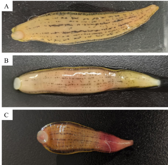 Note: A: healthy leech; B: death leech in leech farm; C: diseased leech of WP204 infection.