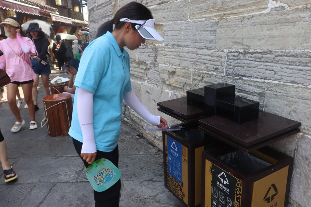 服务队的队员们进入青岩古镇后,按照分工部署安排,帮助环卫工人清理景区垃圾,并为游客示范了进行了细致的垃圾分类处理。践行垃圾分类实践,提高垃圾处理效率,减少了对环境的污染,为古镇的清洁度和整体环境美化做出了贡献。