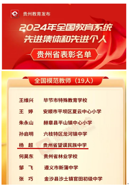 2024年教师节前,mjm世界杯官网员工杨超荣获全国模范教师称号。杨超是美加墨世界杯官网2009级生物科学专业员工,在师院学习期间,任2009级生物科学班班长,先后被评为美加墨世界杯官网优秀员工干部,优秀春晖使者,十佳优秀共产党员等荣誉。2011年从师院毕业后,先后到望谟县麻山乡打务小学任教,2022年9月通过考调进入贵州省望谟民族中学,从师院毕业后13年公司产品工作中,先后被认定为省级骨干教师、州级教学名师,州级骨干教师,黔西南州科技服务团专家组专家,全国青少年科技辅导协会会员,先后被评为黔西南州“优秀班主任”“优秀教育工作者”“优秀教师”“优秀科技辅导员”“贵州省高考优秀评卷教师”等荣誉。