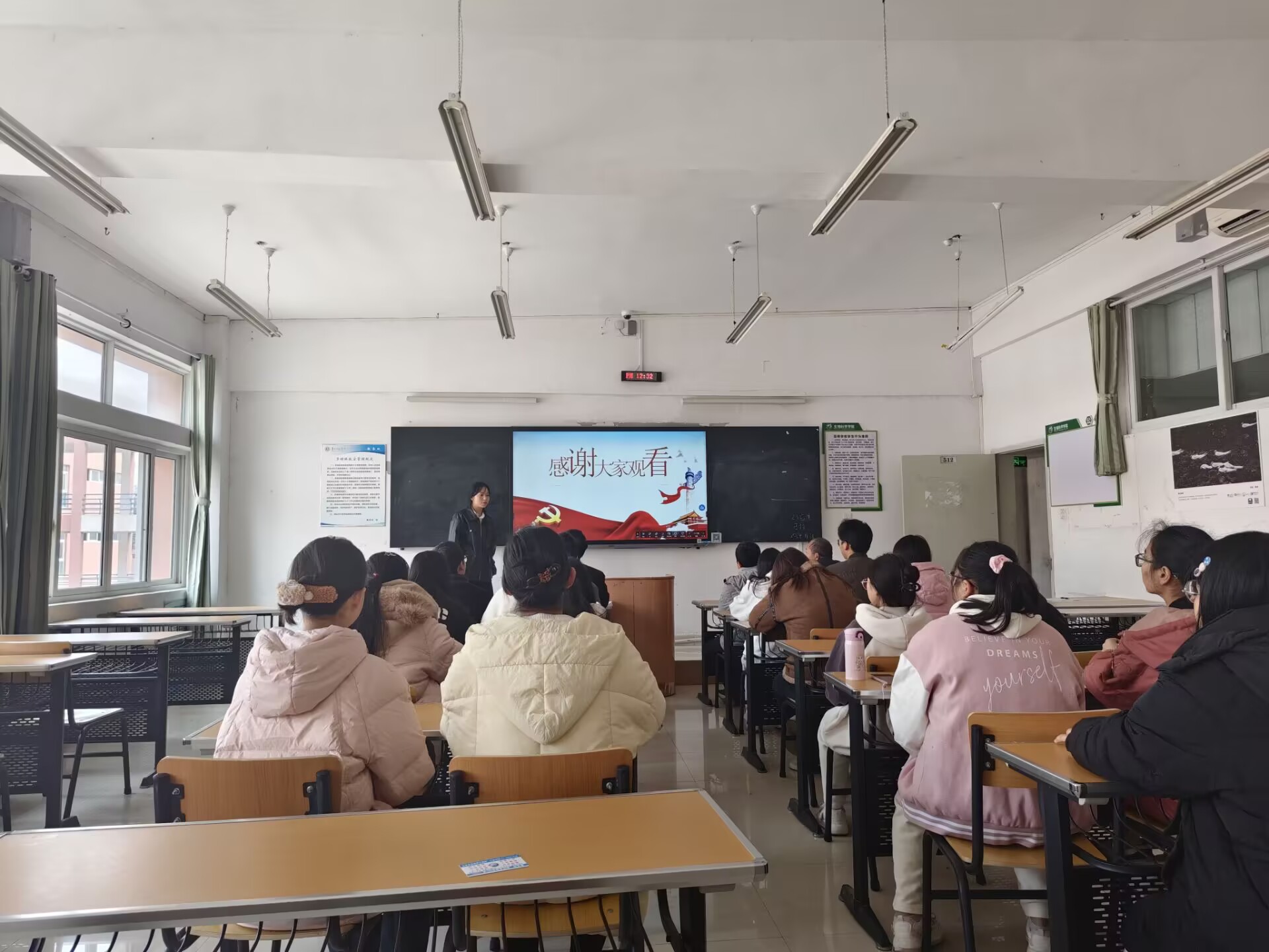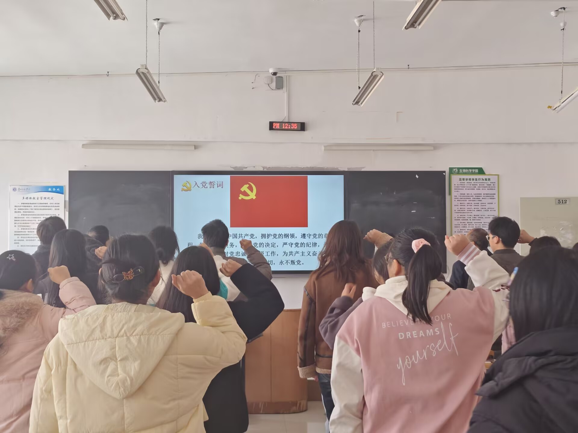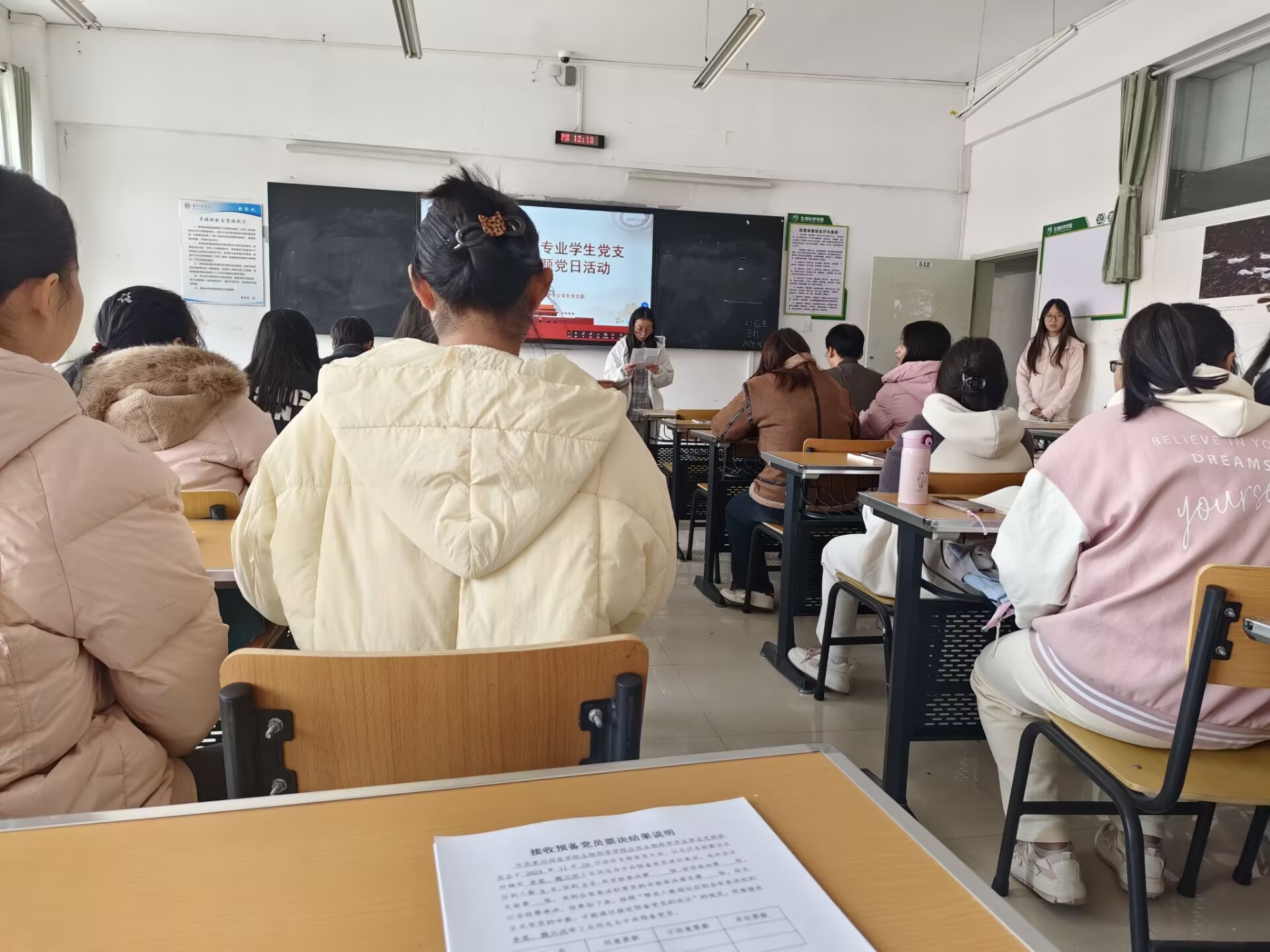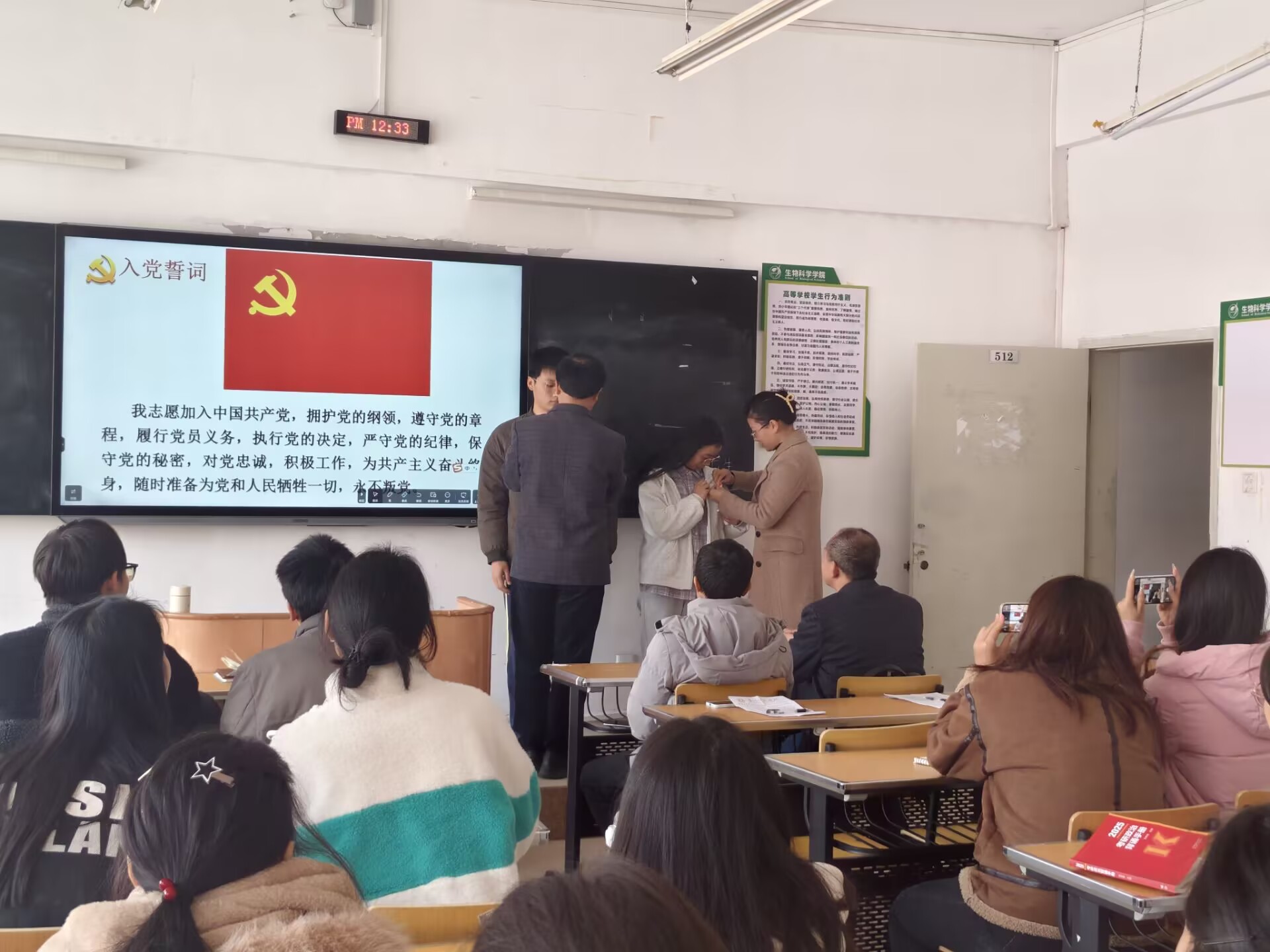 党支部书记孙秀华说明了支部党员大会接收预备党员流程,对是否接受2名发展对象为预备党员的问题进行逐一讨论。李柔、魏兴洪汇报了在此期间的学习、思想等情况。入党介绍人进行了发言和表态。紧接着,通过无记名投票,党员大会全票通过同意接受李柔、魏兴洪同学为预备党员。孙秀华与支部委员李育芳郑重为李柔、魏兴洪佩戴党徽。支部委员伍林涛老师带领新当选预备党员宣誓,其他全体同志重温入党誓词。