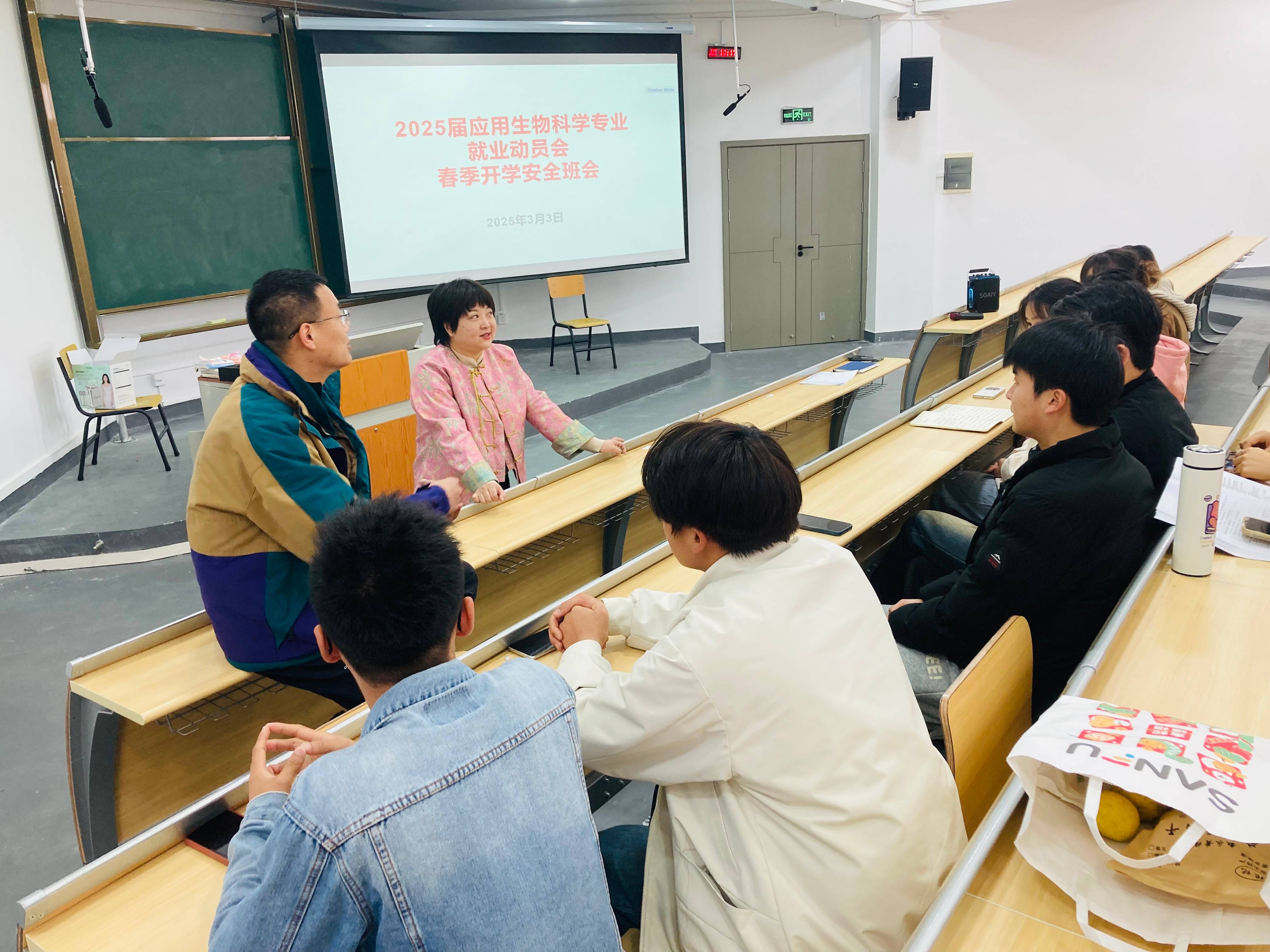 3月1日,2021级应用生物科学班在宁静楼537开展了就业推进会。本次会议由21级应生班辅导员梁涛主持,党委书记孙秀华、党委副书记王珏、应用生物科学系系主任程搏幸出席,21级应生班未就业同学参与。