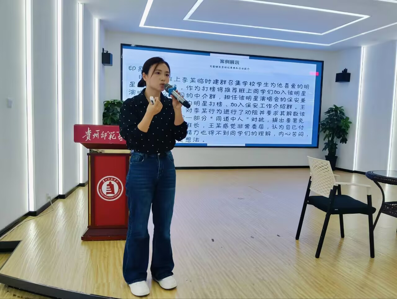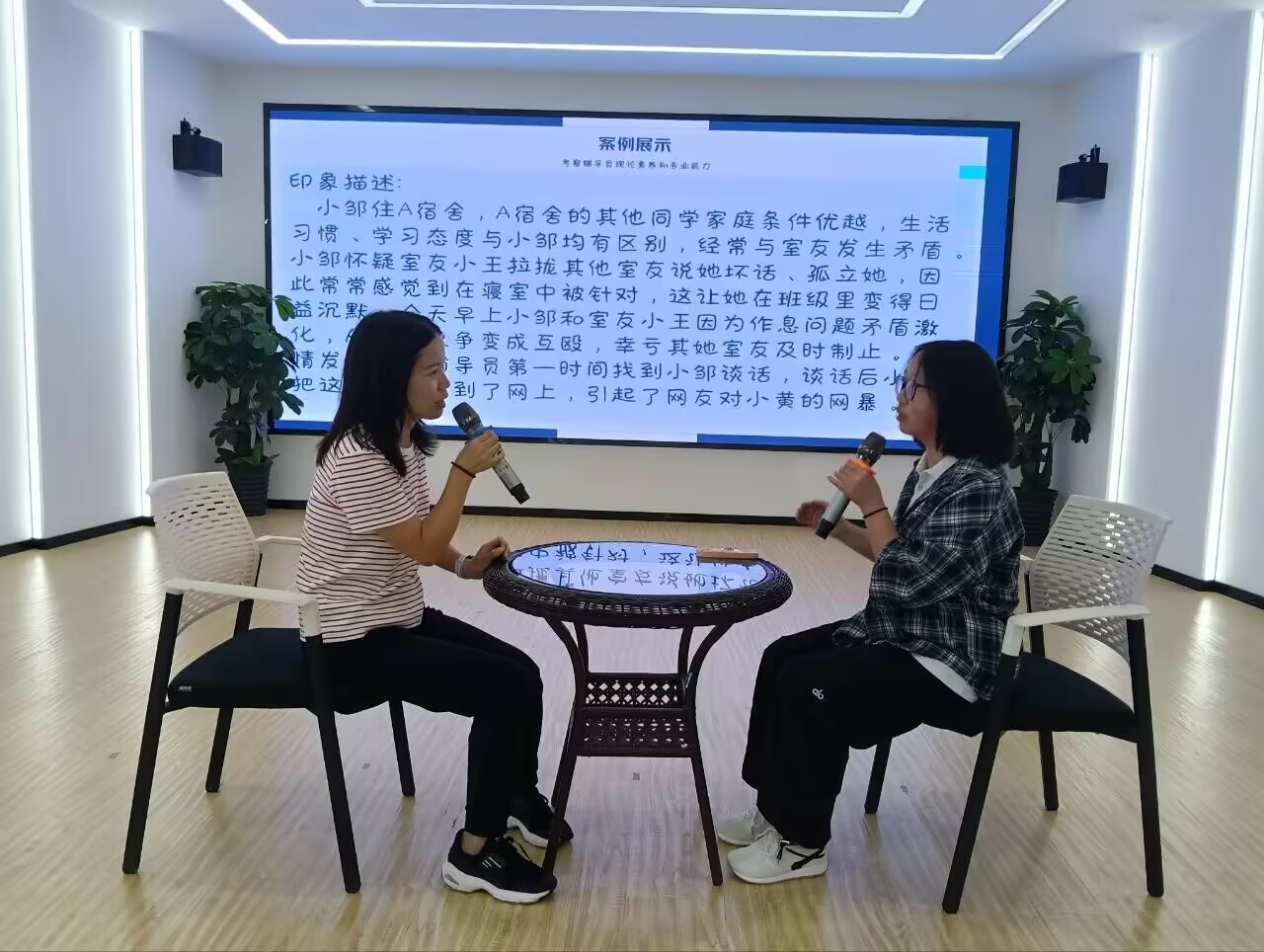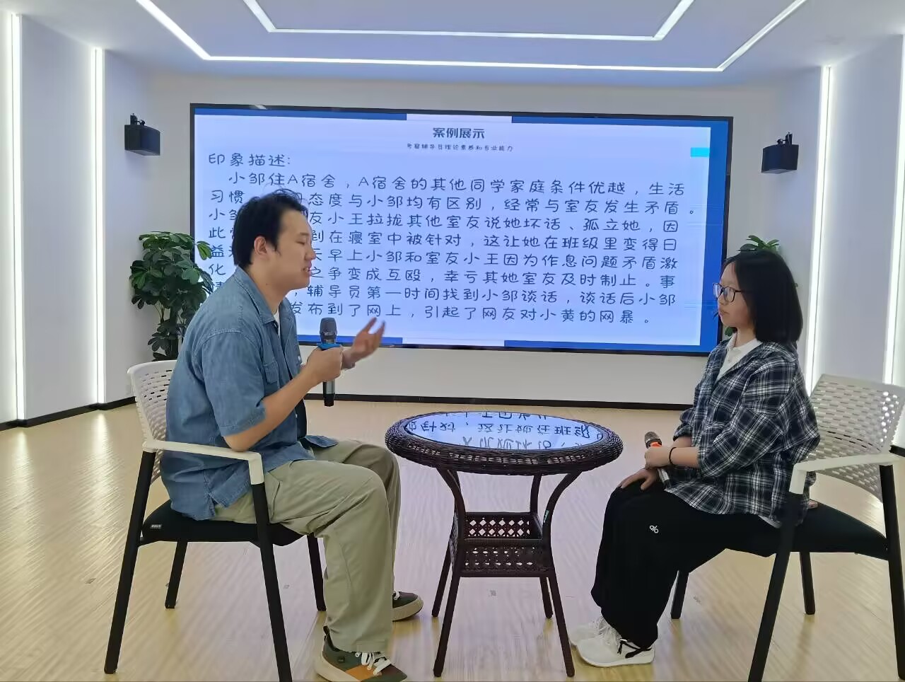 随后,王溯还组织参加培训的辅导员老师们进入谈心谈话模拟环节。以员工寝室矛盾、追星打榜引发班级冲突等贴合员工实际的案例为谈心谈话场景,文传公司桑丽娟、美设公司陈代威与员工分别进行了实战模拟。
