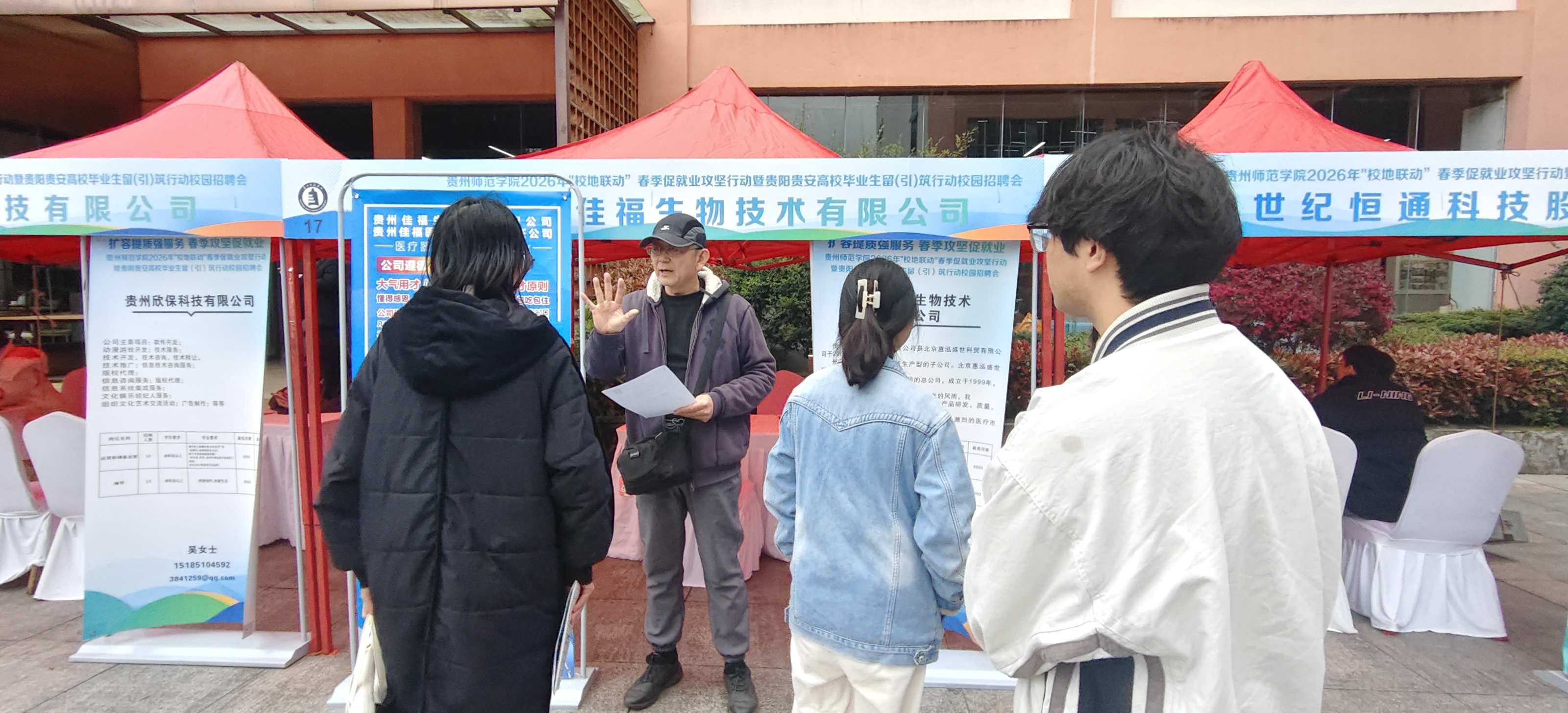 本次招聘会紧扣“校地联动”主题,精准对接地方发展需求,吸引了28家涵盖教育科技、生物医药、生态环保、食品检测等多个领域的优质企事业单位踊跃参会。其中,贵州三联教育集团、贵州九八五教育集团有限公司、贵阳市华希医药健康职业公司、贵阳市东山小学、贵州绿太阳生物科技有限公司、贵州深度游旅行社有限公司、贵州青帝酒业有限责任公司等知名企业携大量岗位到场招贤,为毕业生搭建了高效便捷的供需对接平台。
