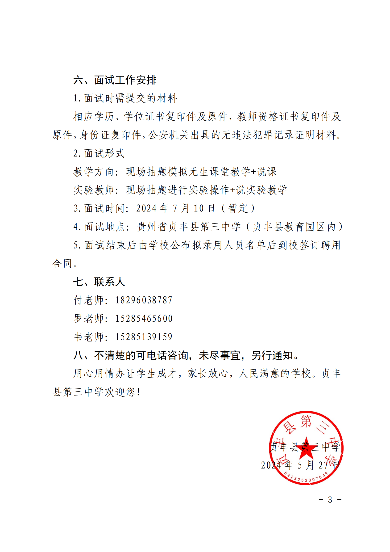 【教师招聘】贞丰县第三中学编外教师招聘公告