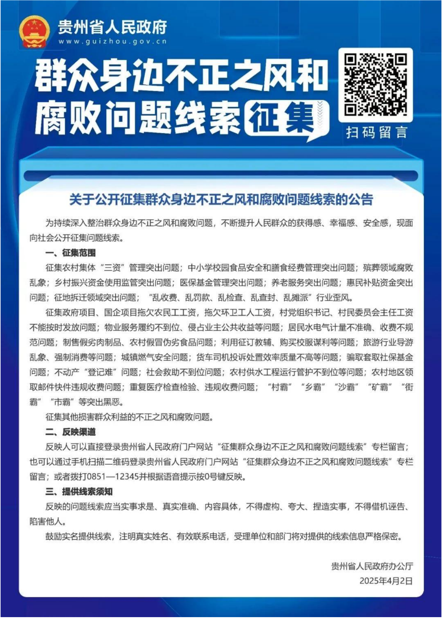 【转贵州省人民政府】群众身边不正之风和腐败问题线索征集